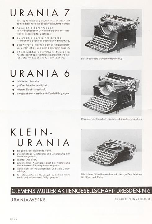 Prospekt für Schreibmaschine Urania Nr. 301 dV