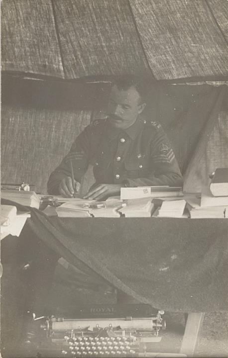 Illustrierte Postkarte; Fotografie, monochrom Rückseite: Mann in Uniform an einem Schreibtisch in einem Feldzelt sitzend, im Vordergrund Schreibmaschine Royal Standard Vorderseite nicht beschrieben