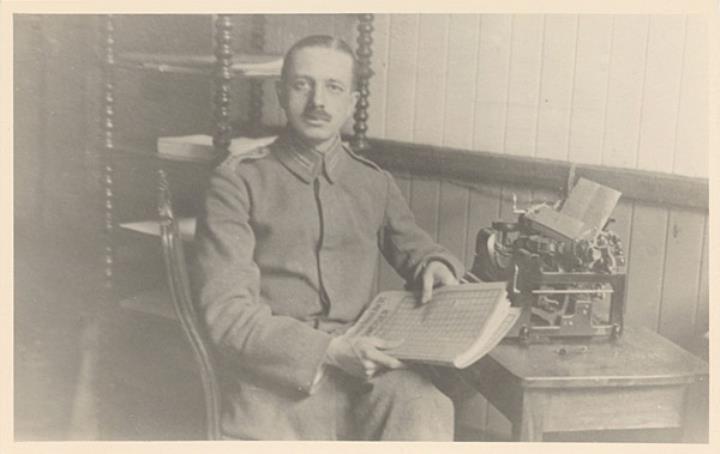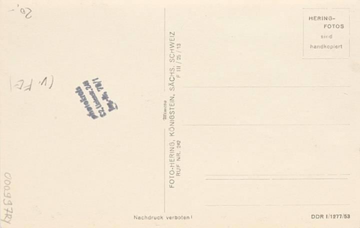 Illustrierte Postkarte; Fotografie, monochrom; Foto-Hering DDR 1/1277/53 Rückseite: Mann in Uniform neben Tisch mit Schreibmaschine Vorderseite nicht beschrieben