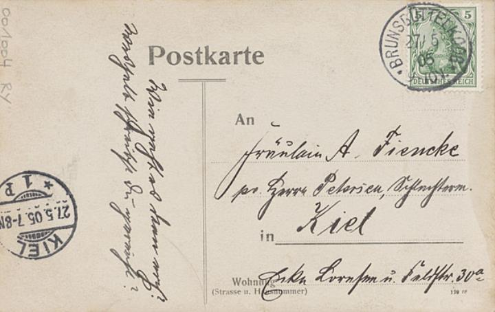 Illustrierte Postkarte; Fotografie, monochrom Rückseite: Mann in Uniform (Matrose) mit Buch und Schreibmaschine; Leerraum beschrieben, datiert 26.V.05 Vorderseite: beschrieben; adressiert an Fräulein Fiencke, Kiel; Briefmarke Deutsches Reich 5 Pf.; Poststempel Brunsbüttelkoog/27.5.1905