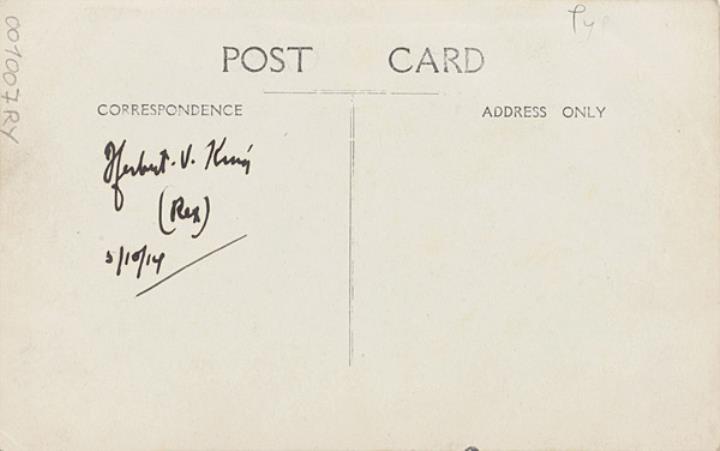 Illustrierte Postkarte; Fotografie, monochrom Rückseite: junger Mann in Uniform (Sanitätskorps) mit Schreibmaschine Bar-Lock vor einem Feldzelt sitzend Vorderseite: beschrieben, datiert 5.10.1914