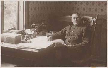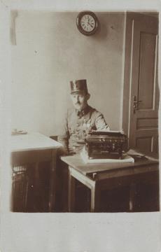 Illustrierte Postkarte; Fotografie, monochrom Rückseite: Mann in Uniform in einem Zimmer mit Schreibmaschine Vorderseite nicht beschrieben