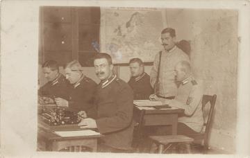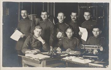 Illustrierte Postkarte; Fotografie, monochrom Rückseite: acht Männer in Uniform (einer mit Schreibmaschine) posieren für ein Gruppenbild in einer Schreibstube Vorderseite nicht beschrieben