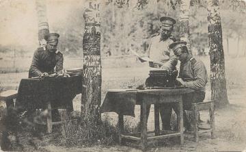 Illustrierte Postkarte; Fotografie, monochrom; Nr. 217 Rückseite: Aufnahme im Freien; drei Männer in Uniform (einer mit Schreibmaschine) bei der Arbeit in einem Feldbüro Vorderseite mit Beschreibungstext in russischer Sprache