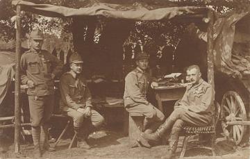 Illustrierte Postkarte; Fotografie, monochrom Rückseite: Aufnahme im Freien; vier Männer in Uniform posieren vor einem Feldzelt, Tisch mit Schreibmaschine Vorderseite nicht beschrieben