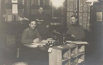 Illustrierte Postkarte; Fotografie, monochrom Rückseite: drei Männer in Uniform (einer mit Schreibmaschine) in einer Schreibstube Vorderseite nicht beschrieben
