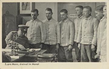 Illustrierte Postkarte; Fotografie, monochrom; Wehrmachtsfoto 181/4 Rückseite: Büroszene; Mann in Uniform zahlt Soldaten ihr Sold, im Vordergrund Tisch mit Schreibmaschine Vorderseite: beschrieben, adressiert; Briefmarke Deutsches Reich 6 RPf.; Poststempel Horb/13 Mai 1938