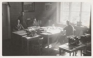 Illustrierte Postkarte; Fotografie, monochrom Rückseite: vier Männer in Uniform in einer Schreibstube mit Schreibmaschinen Vorderseite nicht beschrieben