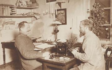 Illustrierte Postkarte; Fotografie, monochrom; Foto: Carl Köst, München Rückseite: zwei Männer (einer in Uniform) in einem Büro mit Schreibmaschine Vorderseite nicht beschrieben