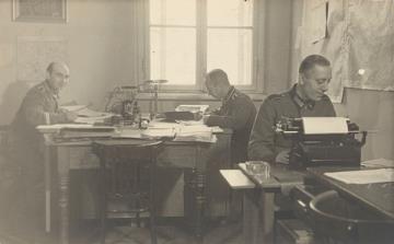 Illustrierte Postkarte; Fotografie, monochrom Rückseite: drei Männer in Uniform in einer Schreibstube mit Schreibmaschine und Telefon Vorderseite nicht beschrieben