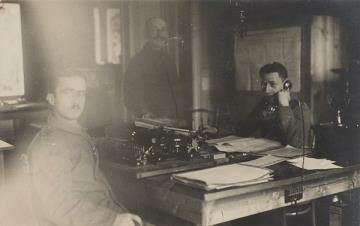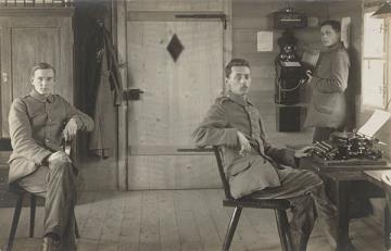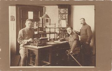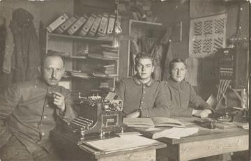Illustrierte Postkarte; Fotografie, monochrom Rückseite: drei Männer in Uniform in einer Schreibstube mit Schreibmaschine Vorderseite: beschrieben, datiert Linz 1917