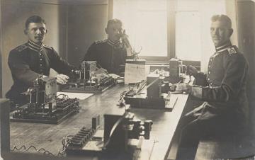 Illustrierte Postkarte; Fotografie, monochrom; Nr. 6988 Rückseite: drei Männer in Uniform in einer Funkerstube mit Telegrafen und Telefon Vorderseite beschrieben, datiert 15.02.1914; adressiert an Fräulein Billich, Metting