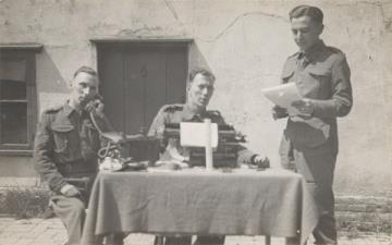 Illustrierte Postkarte; Fotografie, monochrom Rückseite: Aufnahme im Freien; drei Männer in Uniform mit Schreibmaschine und Feldtelefon Vorderseite nicht beschrieben