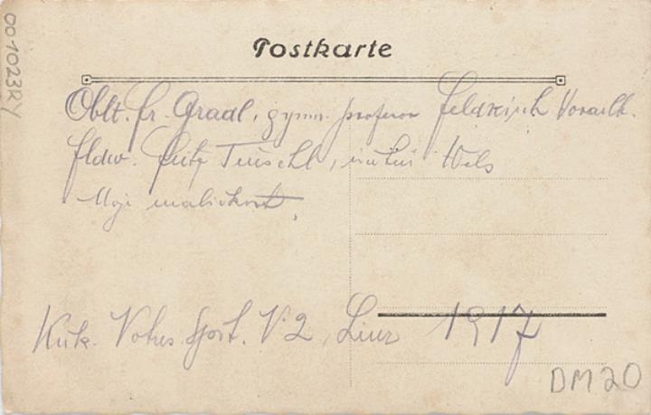 Illustrierte Postkarte; Fotografie, monochrom Rückseite: drei Männer in Uniform in einer Schreibstube mit Schreibmaschine Vorderseite: beschrieben, datiert Linz 1917