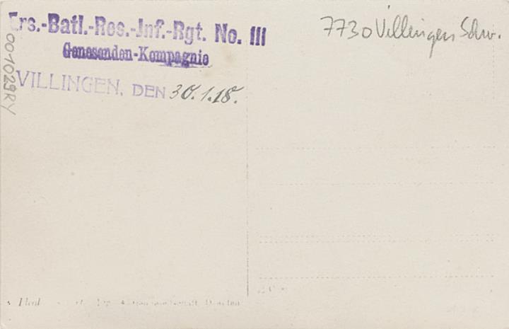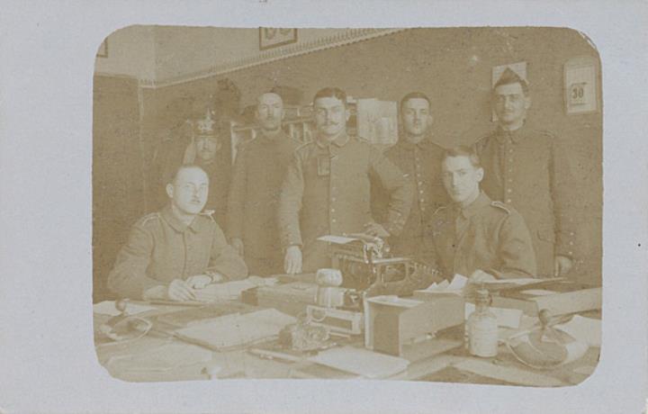 Illustrierte Postkarte; Fotografie, monochrom Rückseite: Männer in Uniform posieren für ein Gruppenbild in einer Schreibstube Vorderseite: beschrieben; Stempel: Ers.-Batl.-Res.-Inf.-Rgt. No. III Villingen, den 30.1.1918