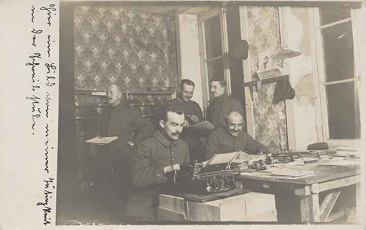 Illustrierte Postkarte; Fotografie, monochrom; Nr. 7519 Rückseite: Männer in Uniform in einer Schreibstube mit Schreibmaschine, Wandregal mit Zeitung "Leipziger Neueste Nachrichten"; Rand beschrieben Vorderseite nicht beschrieben