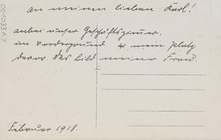 Illustrierte Postkarte; Fotografie, monochrom Rückseite: fünf Männer in Uniform in einer Schreibstube mit Schreibmaschine Vorderseite: beschrieben, datiert 1918