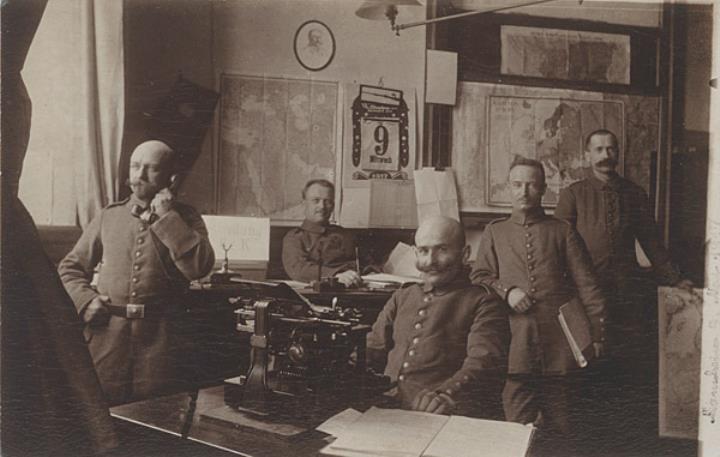 Illustrierte Postkarte; Fotografie, monochrom Rückseite: fünf Männer in Uniform in einer Schreibstube mit Schreibmaschine und Telefon, Wandkalender mit Blatt 9.5.1917 Vorderseite beschrieben (Kaserne Mannheim, 9.5.1917)