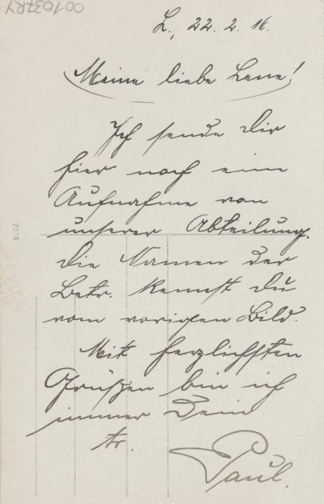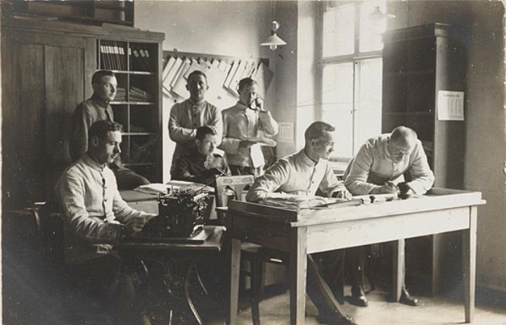 Illustrierte Postkarte; Fotografie, monochrom; Nr. 2334 Rückseite: sieben Männer in Uniform in einer Schreibstube mit Schreibmaschine und Telefon Vorderseite: beschrieben, datiert 22.2.1916, vgl. Inv. Nr. 001038
