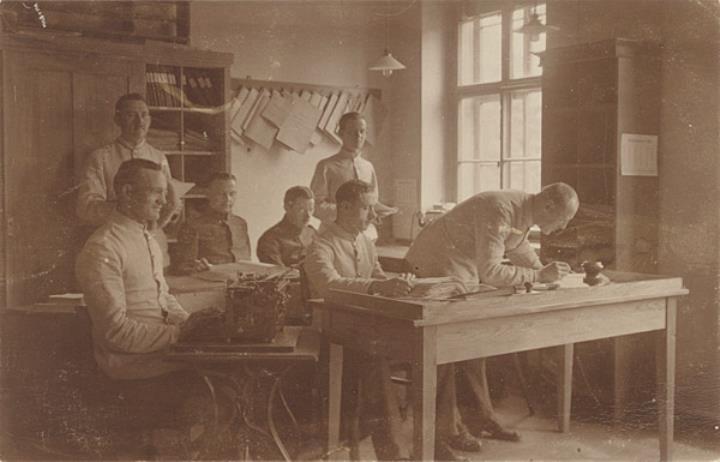 Illustrierte Postkarte; Fotografie, monochrom Rückseite: sieben Männer in Uniform in einer Schreibstube mit Schreibmaschine und Telefon Vorderseite nicht beschrieben, vgl. Inv. Nr. 001037