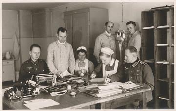 Illustrierte Postkarte; Fotografie, monochrom Rückseite: zwei Frauen (Pflegerinnen) und fünf Männer in Uniform und Lazarettkleidung in einer Schreibstube, Tisch mit Faszikeln und Schreibmaschinen Vorderseite beschrieben: [...] Reservelazarett [...] Frankfurt/Oder, den 2. Februar 1940