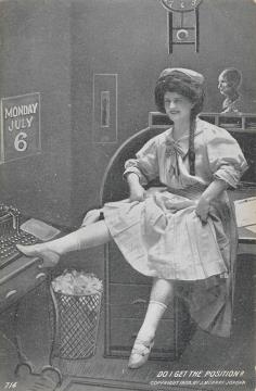 Illustrierte Postkarte; Grafik, monochrom copyright 1908 J. Murray Jordan Rückseite: Büroszene mit Sekretärin Vorderseite nicht beschrieben