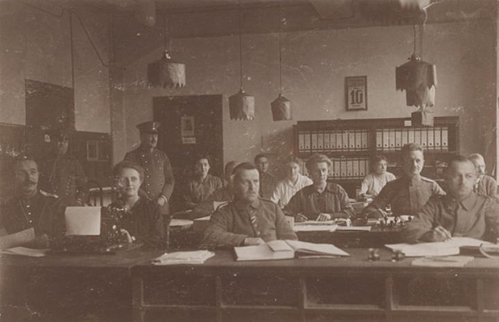 Illustrierte Postkarte; Fotografie, monochrom; 4576 Rückseite: Männer in Uniform und Frauen (eine mit Schreibmaschine) in einem Büro, Wandkalender mit Blatt Sonnabend 10. Februar Vorderseite nicht beschrieben