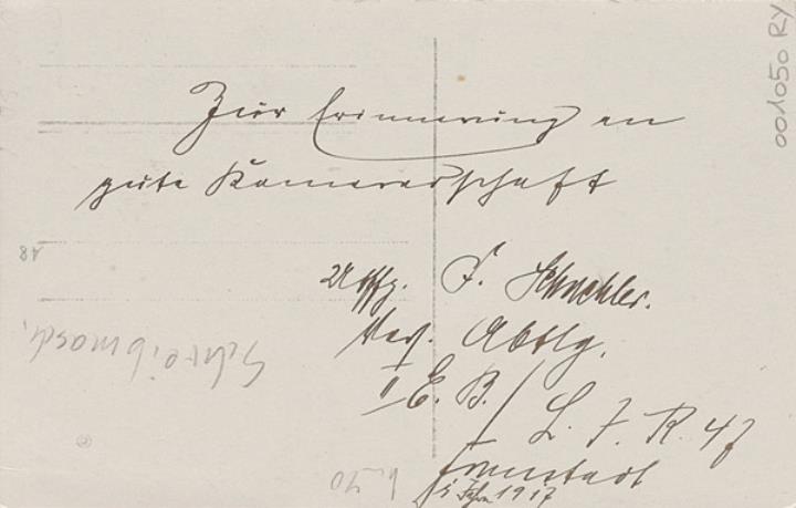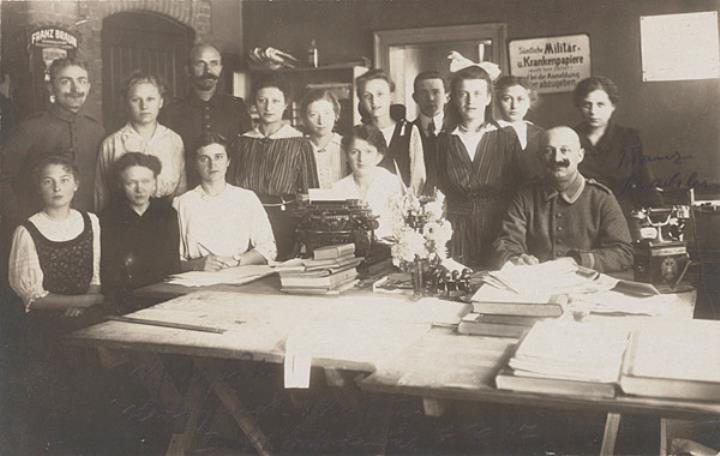 Illustrierte Postkarte; Fotografie, monochrom Rückseite: Frauen und Männer (einige in Uniform) posieren für ein Gruppenbild; Schreibtisch mit Büchern, Schreibmaschine und Telefon; mit Bleistift beschrieben Vorderseite: beschrieben (Zur Erinnerung an gute Kameradschaft [...]), datiert 1917