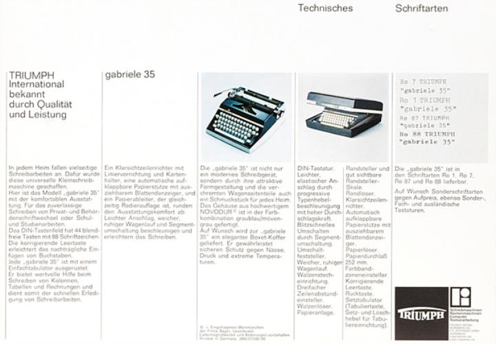 Prospekt für Schreibmaschine Triumph Gabriele 35 universelle Kleinschreibmaschine Nr. 2642/273/80./40