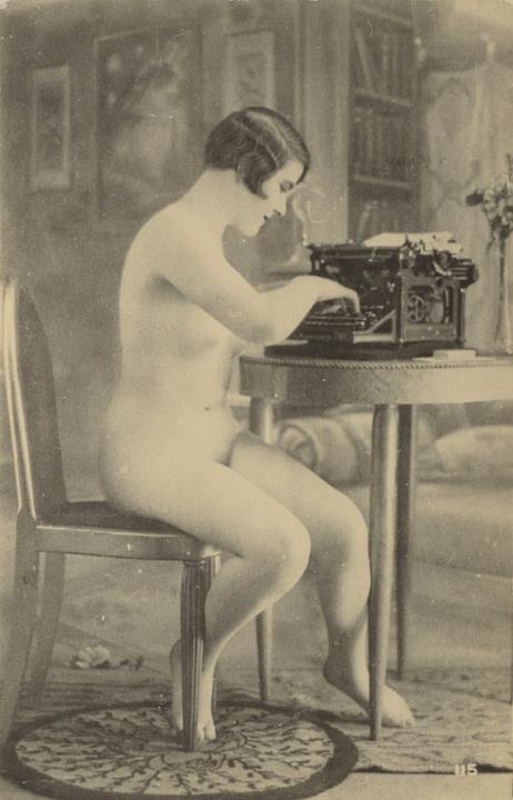 Illustrierte Postkarte; Fotografie, monochrom; Serie Nr. 115 Rückseite: Akt; Frau mit Schreibmaschine Vorderseite nicht beschrieben