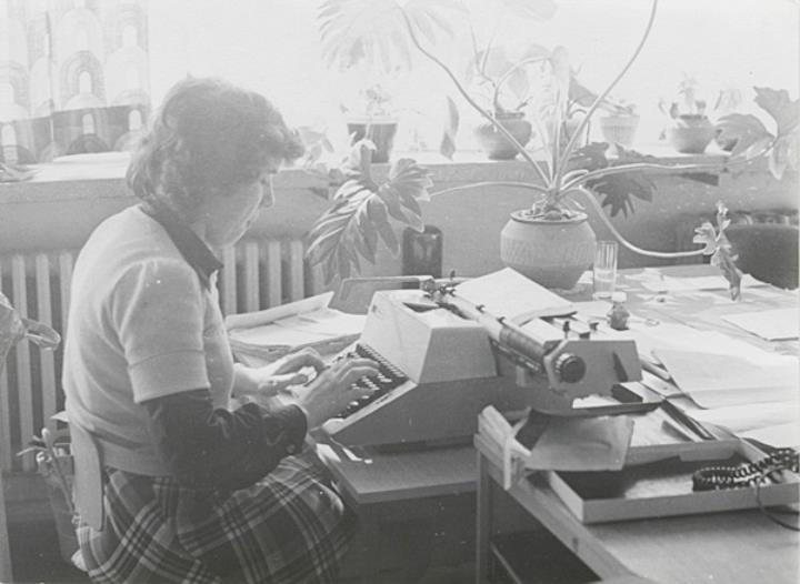 Fotografie, monochrom Sekretärin mit Schreibmaschine (Optima?) in einem Büro