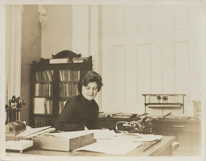 Fotografie, monochrom Sekretärin in einem Büro mit Schreibmaschine und Telefon