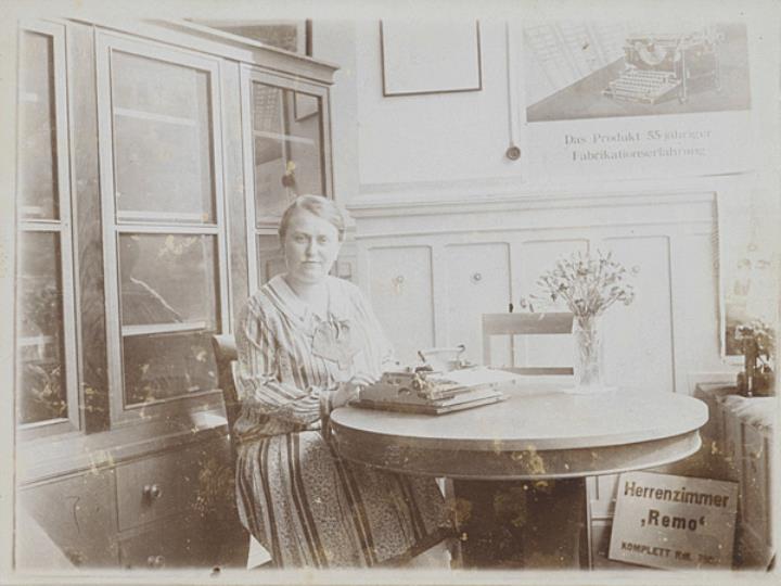 Fotografie, monochrom Zimmeransicht; Frau an einem Tisch mit Schreibmaschine, an der Wand ein Schreibmaschinen-Werbeplakat, am Boden Schild mit Aufschrift (Herrenzimmer "Remo" Komplett RM. 790.-)