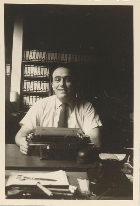 Fotografie, monochrom Mann mit Schreibmaschine in einem Büro