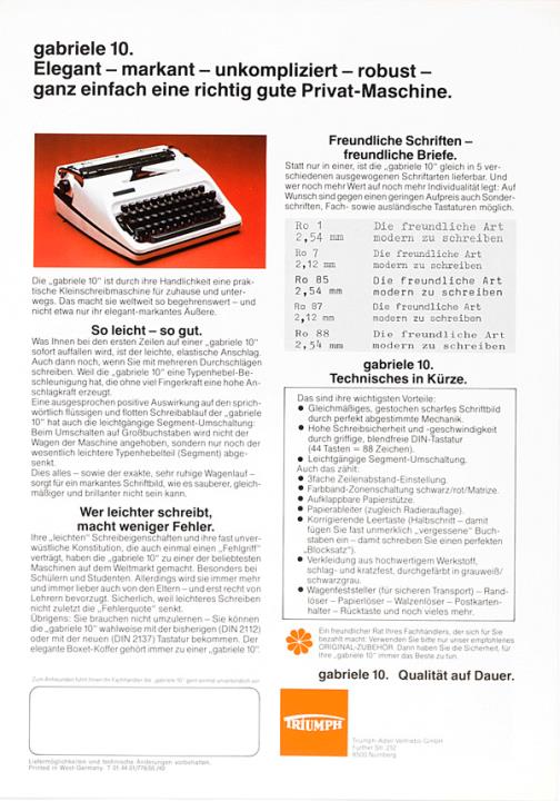 Prospekt für Schreibmaschine Triumph Gabriele 10 Die freundliche Art, schöner zu schreiben. Und schönes Schreiben leichter zu machen Nr. T.01.44.01/779/50/40
