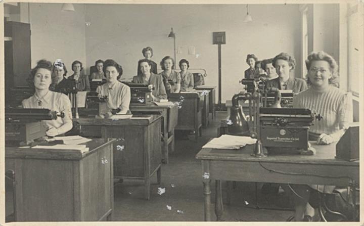 Fotografie, monochrom Ansicht Unterrichtsraum; Lehrerin und Frauen/Schülerinnen mit Schreibmaschinen Rückseite mit Vermerk: c. 1930