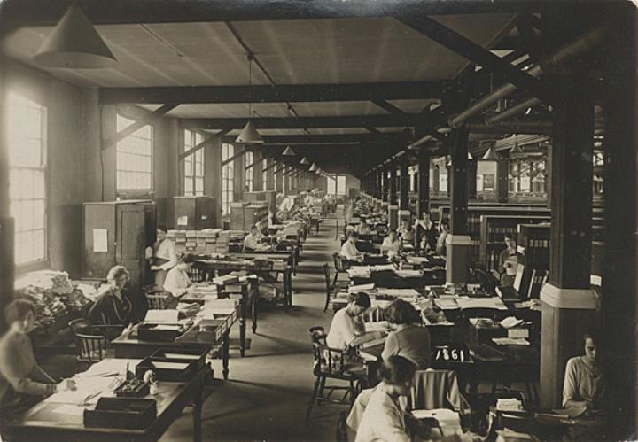 Fotografie, monochrom; Nr. 1861 Ansicht eines Großraum-Schreibbüros mit Sekretärinnen Rückseite mit Vermerk: c. 1910