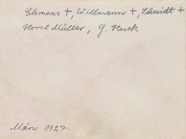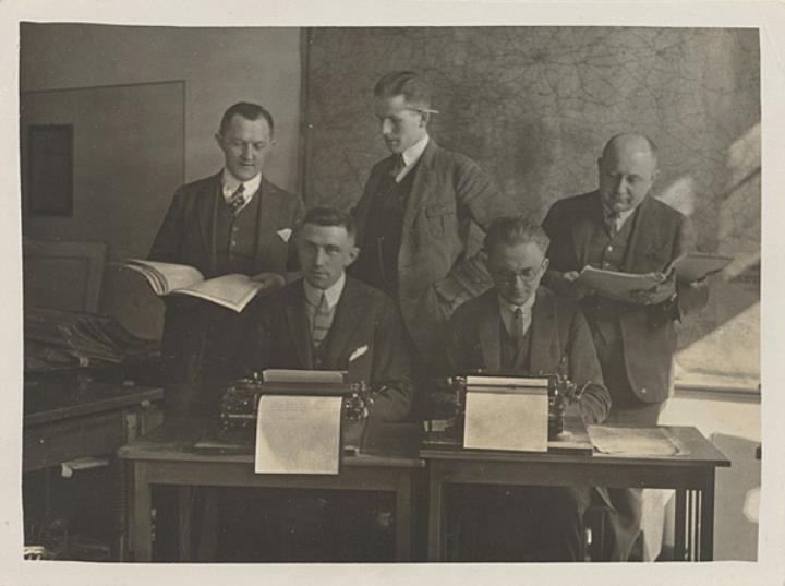 Fotografie, monochrom Büroansicht; fünf Männer im Anzug (zwei mit Schreibmaschine) posieren für ein Gruppenbild Rückseite: beschrieben; datiert März 1927