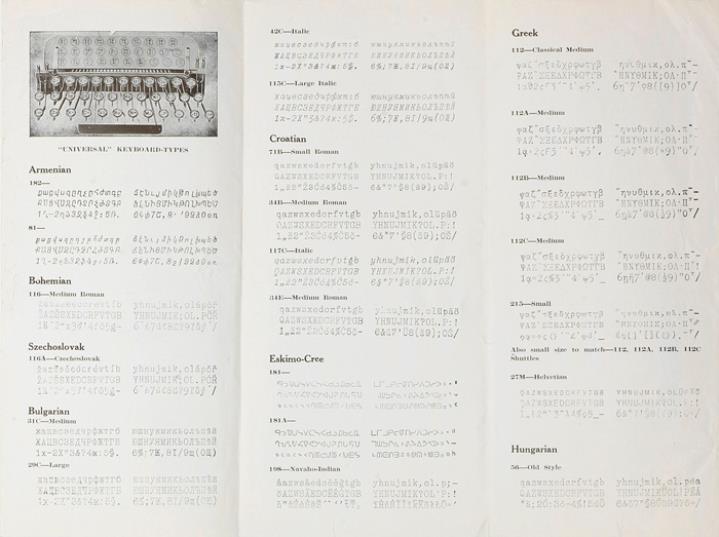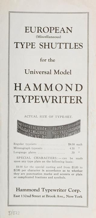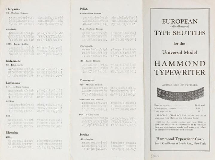 Faltprospekt zu Typenschiffchen/Schriftarten für Schreibmaschine Hammond