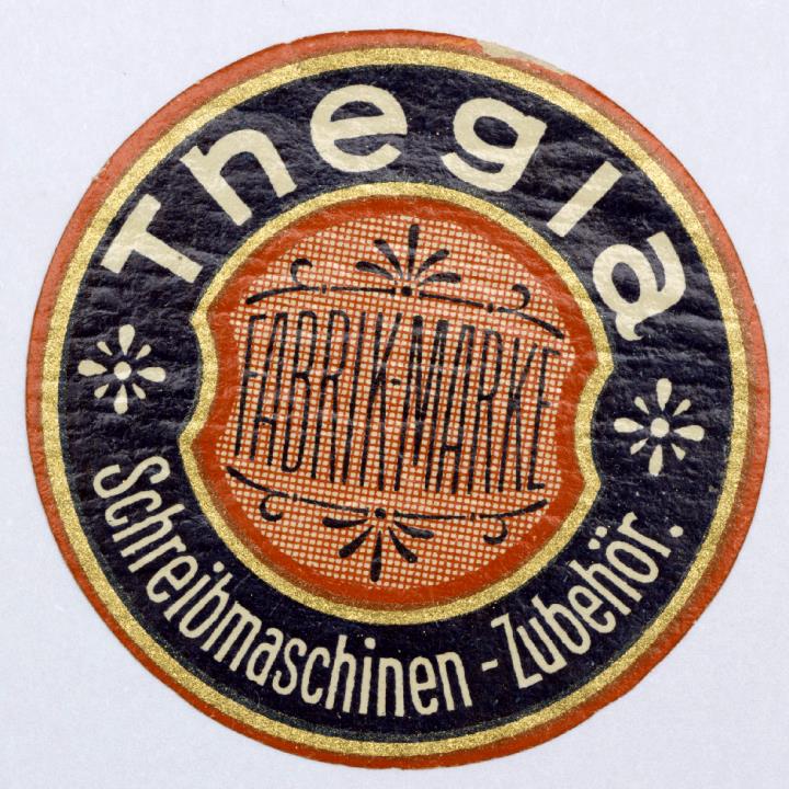 Siegelmarke für Schreibmaschinenzubehör Thegla Fabrik-Marke rund, polychrom