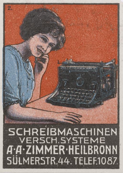 Reklamemarke/Werbemarke für Schreibmaschinenhandlung Zimmer; rechteckig, polychrom Text: Schreibmaschinen versch. Systeme