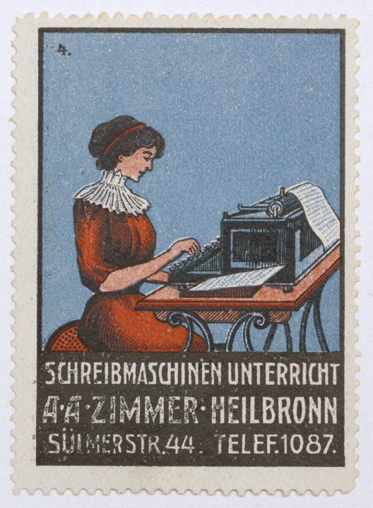 Reklamemarke/Werbemarke für Schreibmaschinenhandlung Zimmer; rechteckig, polychrom Text: Schreibmaschinen Unterricht
