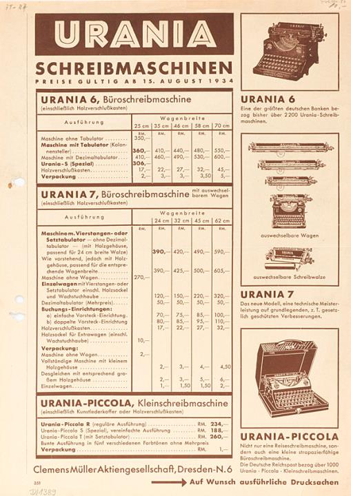 Preisliste für Schreibmaschine Urania gültig ab 15. August 1934 Nr. 351