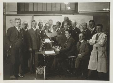 Fotografie, monochrom Männer im Anzug posieren für ein Gruppenbild; in der Mitte Tisch mit Buchungsmaschine Continental (Prototyp?), im Hintergrund Technische Zeichnungen zur Maschine