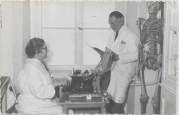Fotografie, monochrom Ansicht Arztpraxis (?); Mann und Frau, beide in weißem Kittel, mit Schreibmaschine; in der Ecke ein Skelett (Anschauungsmodell)