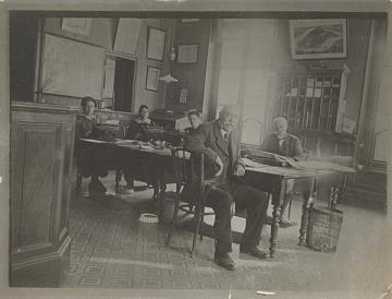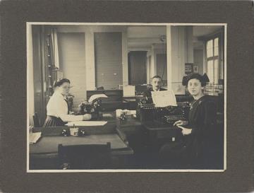 Fotografie, monochrom; auf Karton aufgezogen Büroansicht; zwei Frauen und ein Mann mit Schreibmaschinen Rückseite beschrieben: 29/11-'19