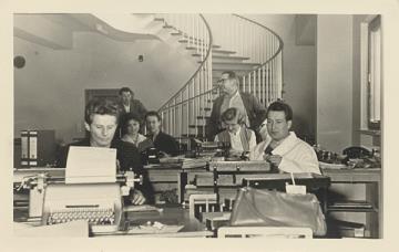 Fotografie, monochrom männliche und weibliche Mitarbeiter in einem Büro, im Vordergrund eine Schreibmaschine Rückseite mit Stempel: Robert Korn Fürth/Bay. (Fotostudio)