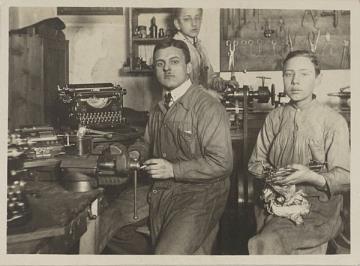 Fotografie, monochrom Mechaniker und zwei Lehrlinge in einer Reparaturwerkstatt für Büromaschinen, im Hintergrund Schreibmaschine Torpedo