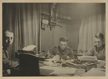 Fotografie, monochrom drei Männer in Uniform in einer Schreibstube mit Schreibmaschine und Telefon