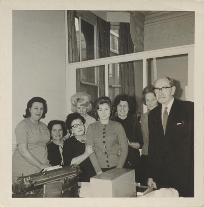 Fotografie, monochrom Büroansicht; Vorgesetzter und Mitarbeiterinnen posieren für ein Gruppenbild Rückseite mit Vermerk: c 1940